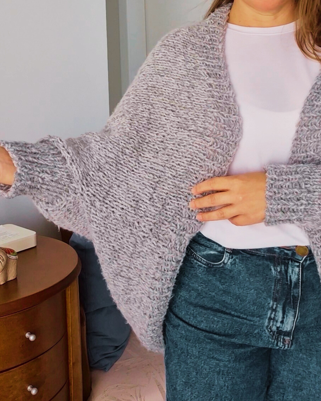 Casaqueto de tricô Amaro. Um casaqueto feito à mão no estilo casulo com mistura de fios acrílicos o que traz leveza e exclusividade a peça. Possui detalhe de trança nas costas.